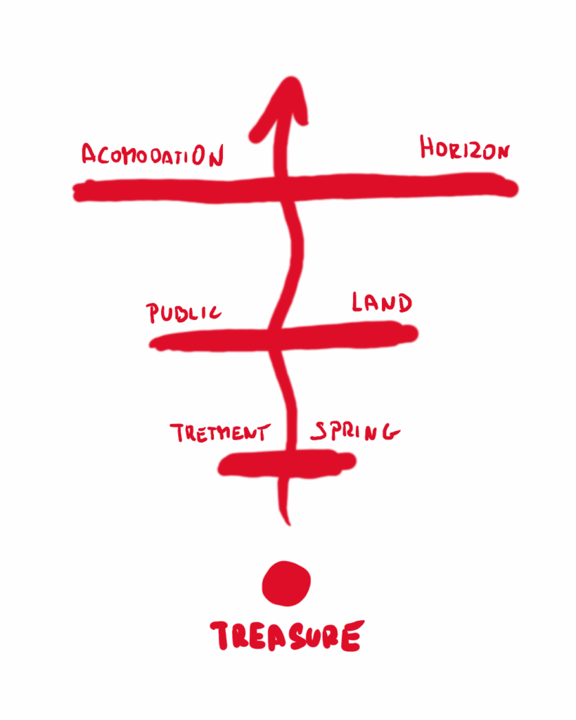 This led to our core spatial concept: EXTRACTING THE HIDDEN TREASURE. The architecture symbolically pulls the healing mineral water from deep within the earth to the surface. The entire project is organized along a vertical journey through three “geological” layers: