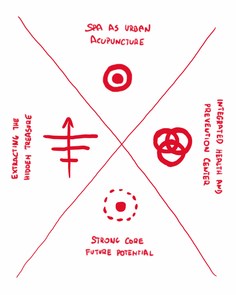 From this emerged our breakthrough. We realized the project’s primary role was not to be an isolated destination, but a strategic urban catalyst. This led to our guiding vision: A SPA AS URBAN ACUPUNCTURE. The new centre would be a precise, targeted impulse designed to stimulate and regenerate the city’s economic, social, and cultural vitality.
